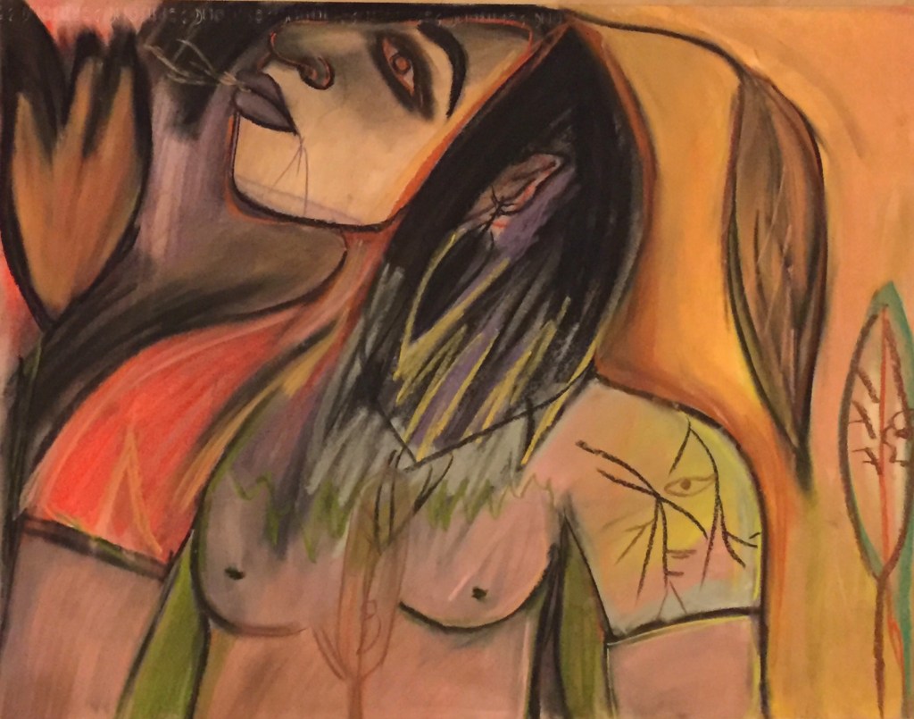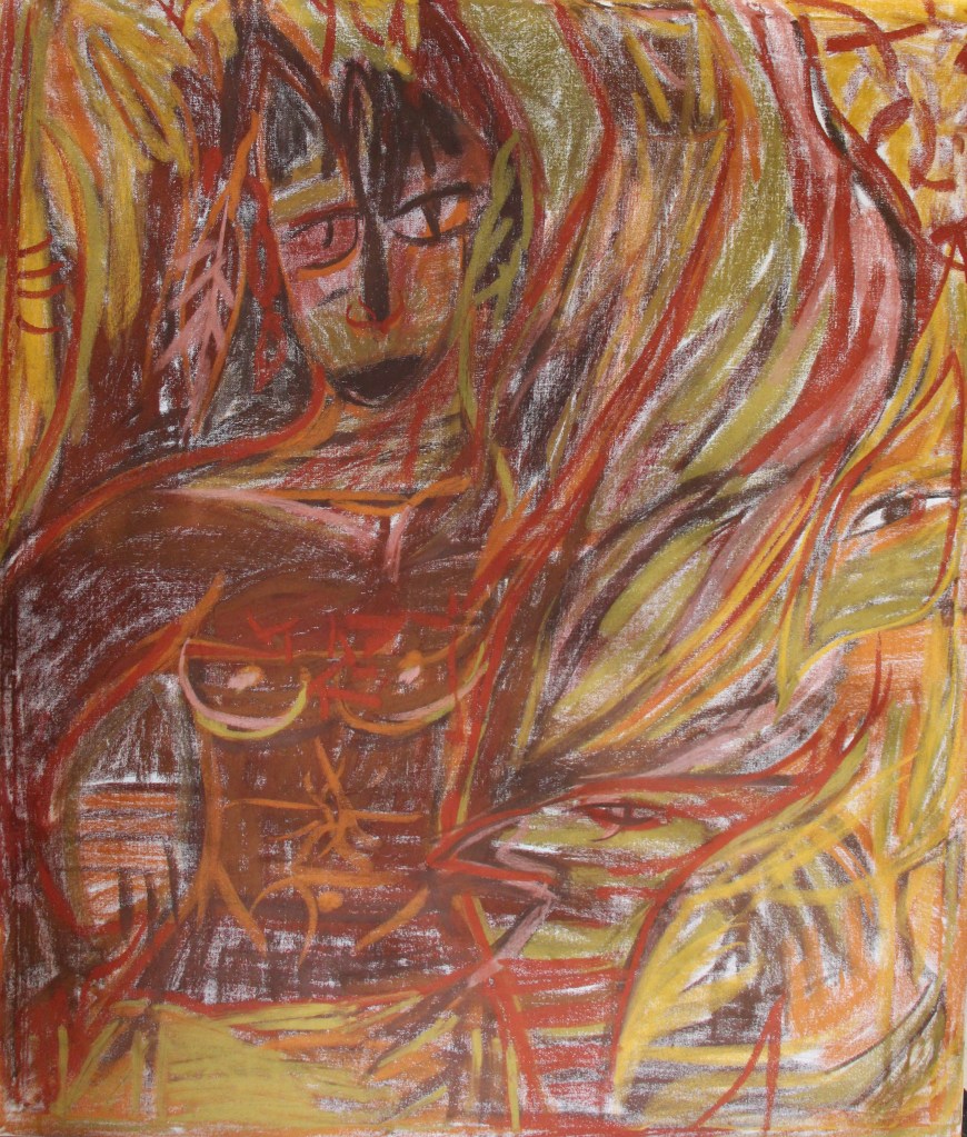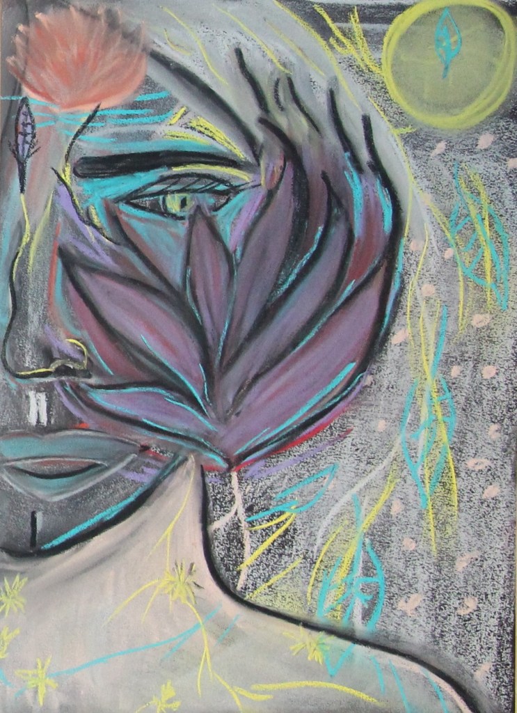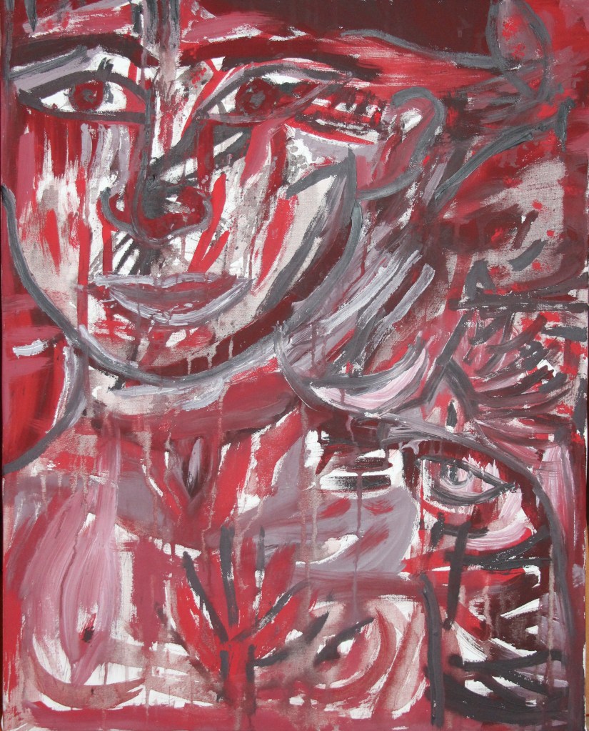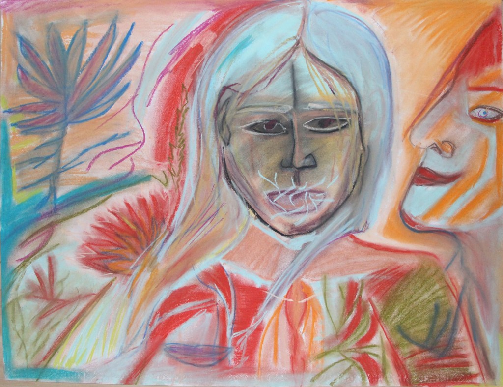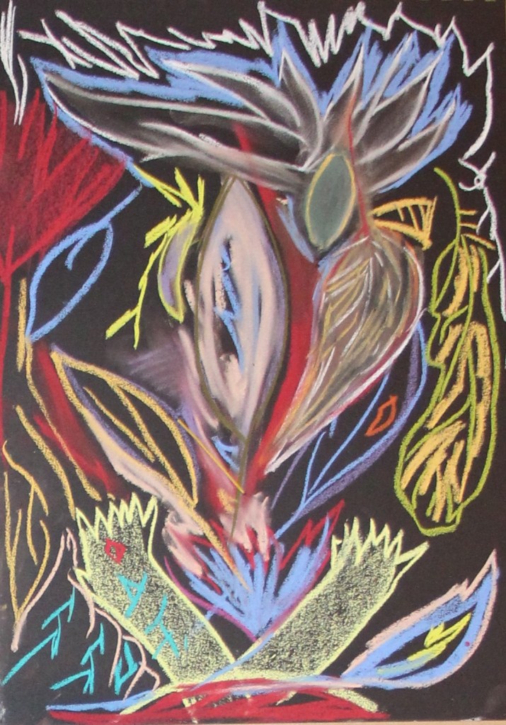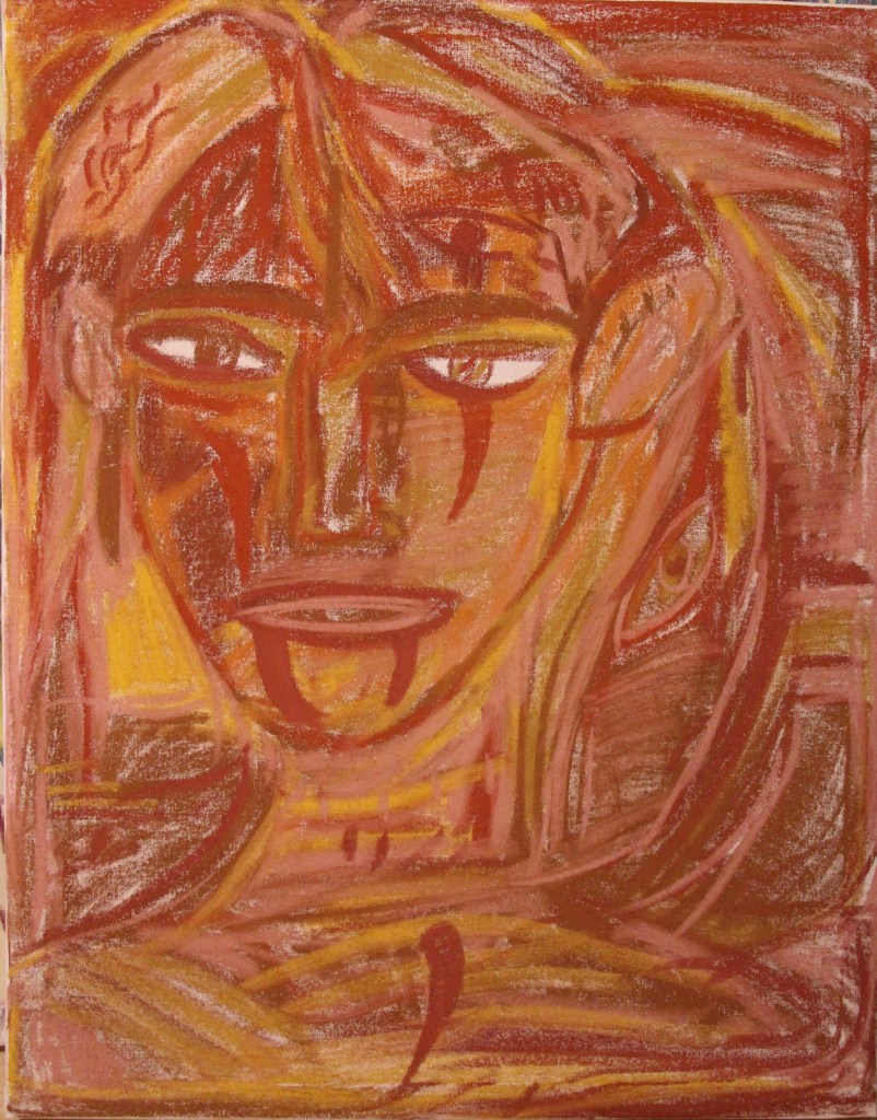 Série de tableaux dans un style brut, réalisés à la craie (pastels tendres et secs) et peintures acryliques.