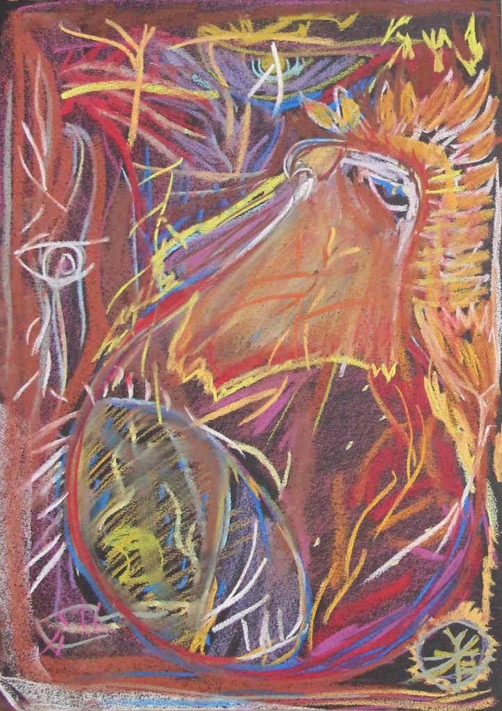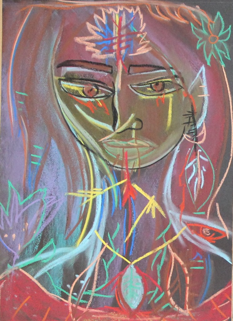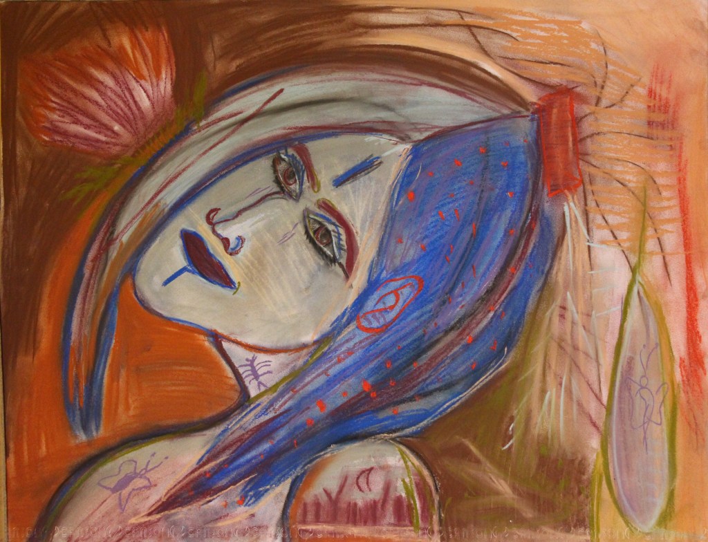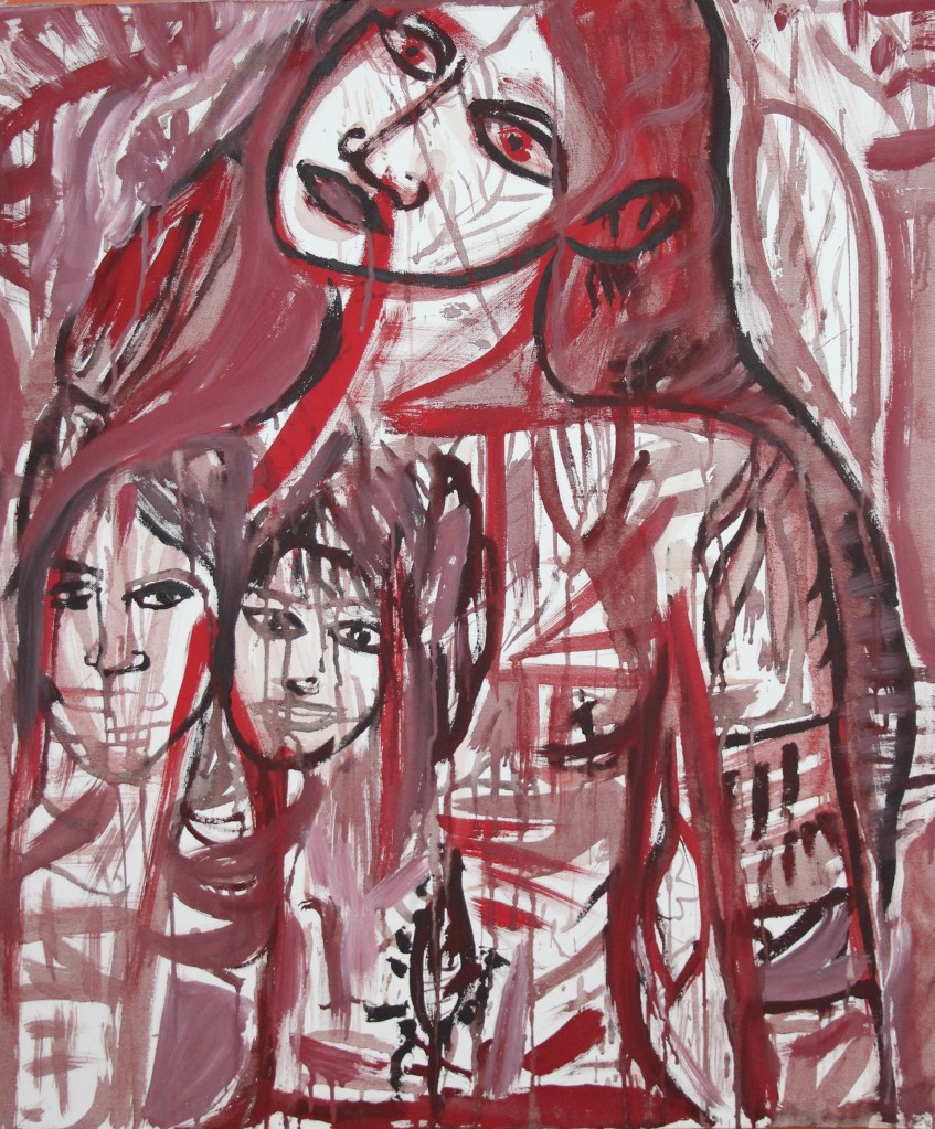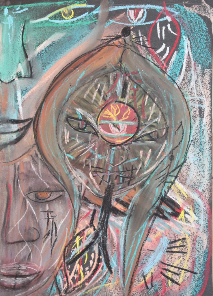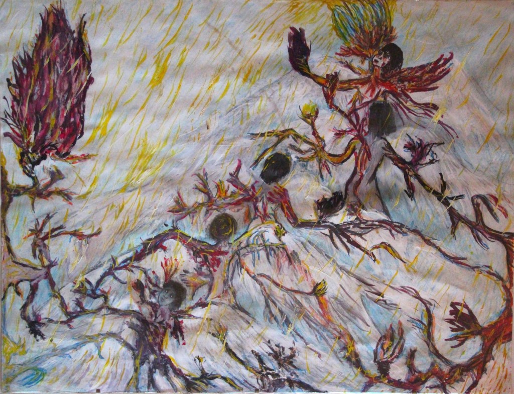 Série de tableaux dans un style brut, réalisés à la craie (pastels tendres et secs) et peintures acryliques.