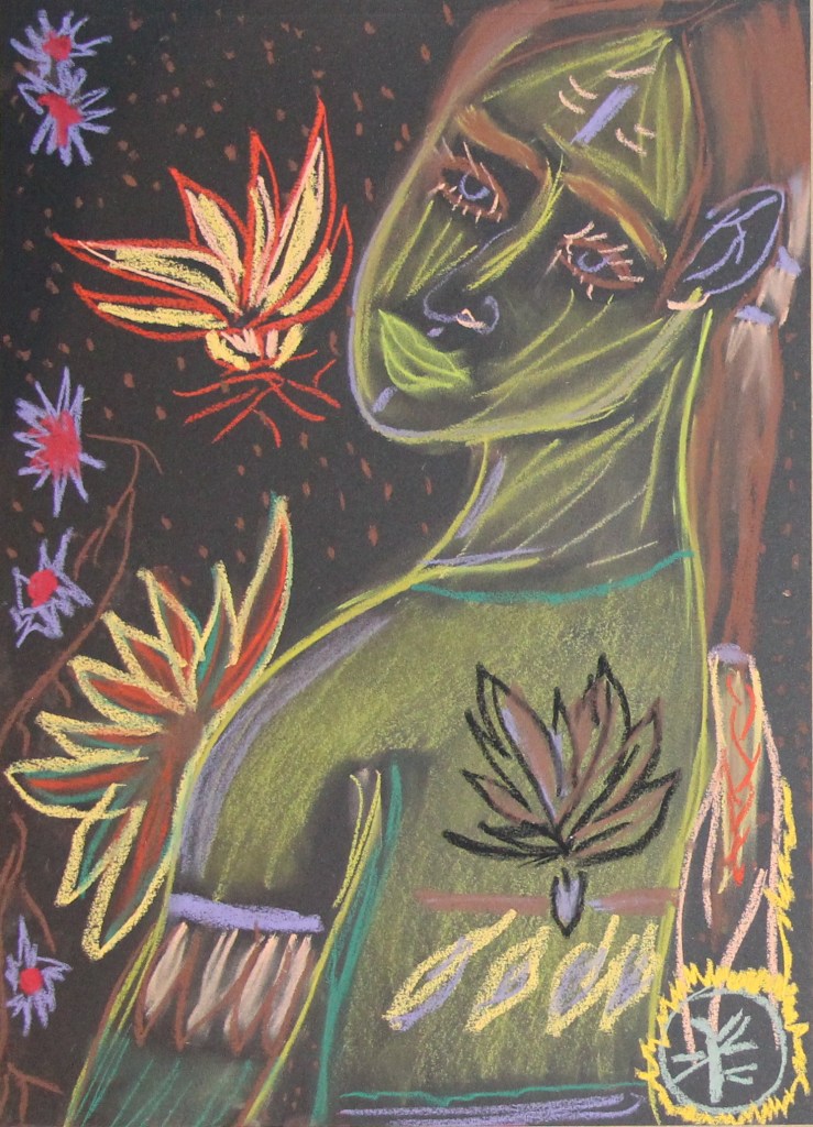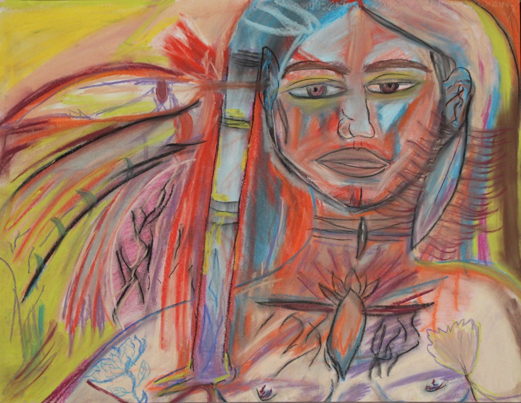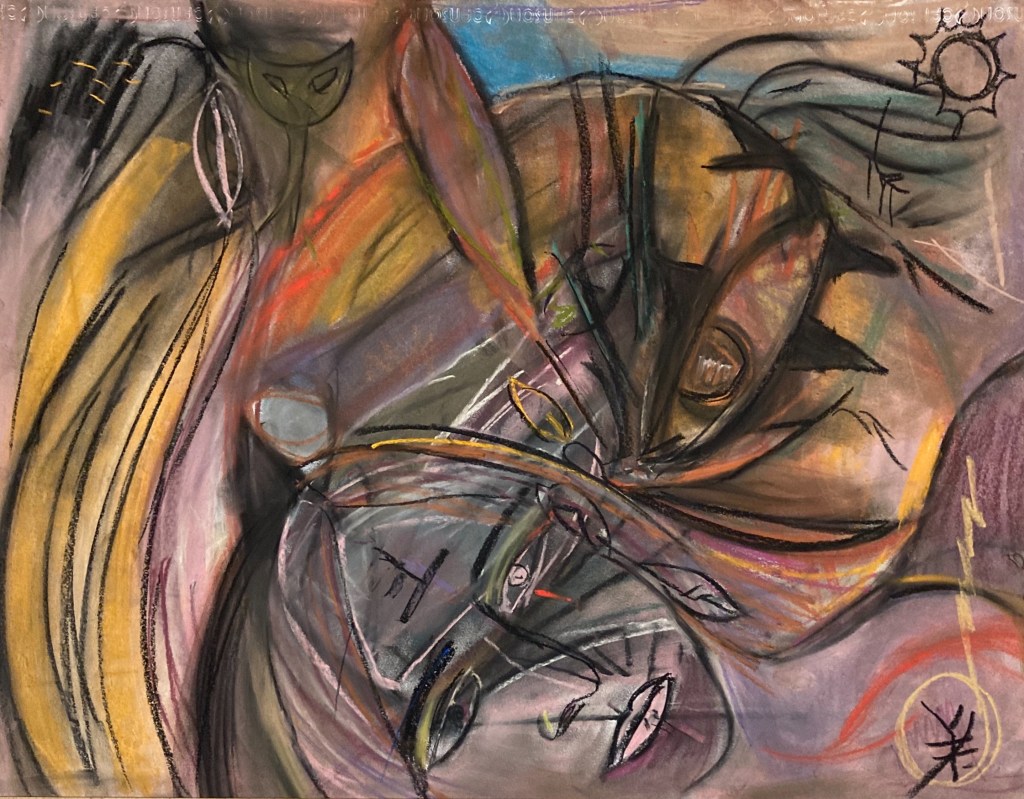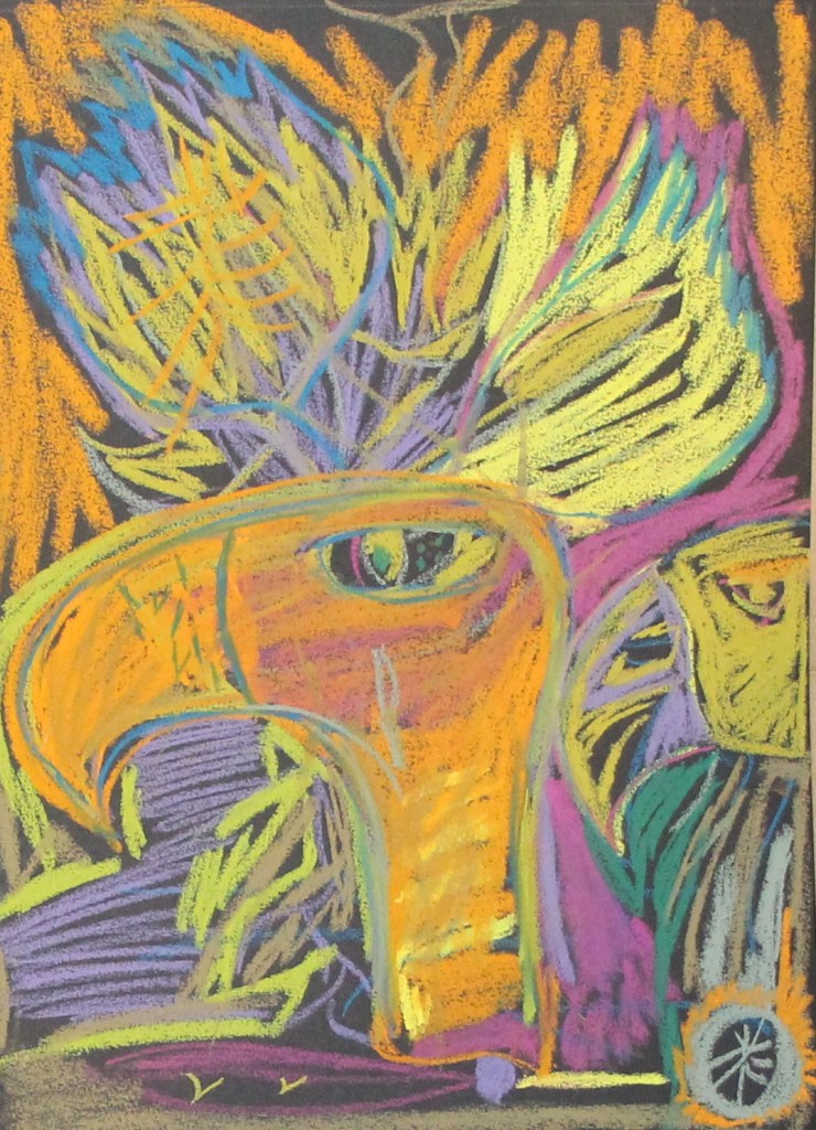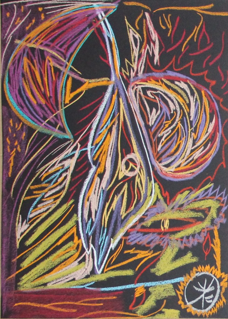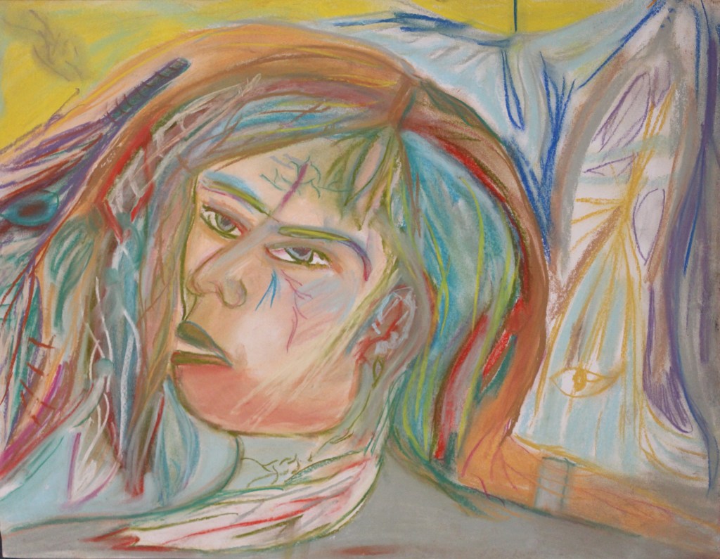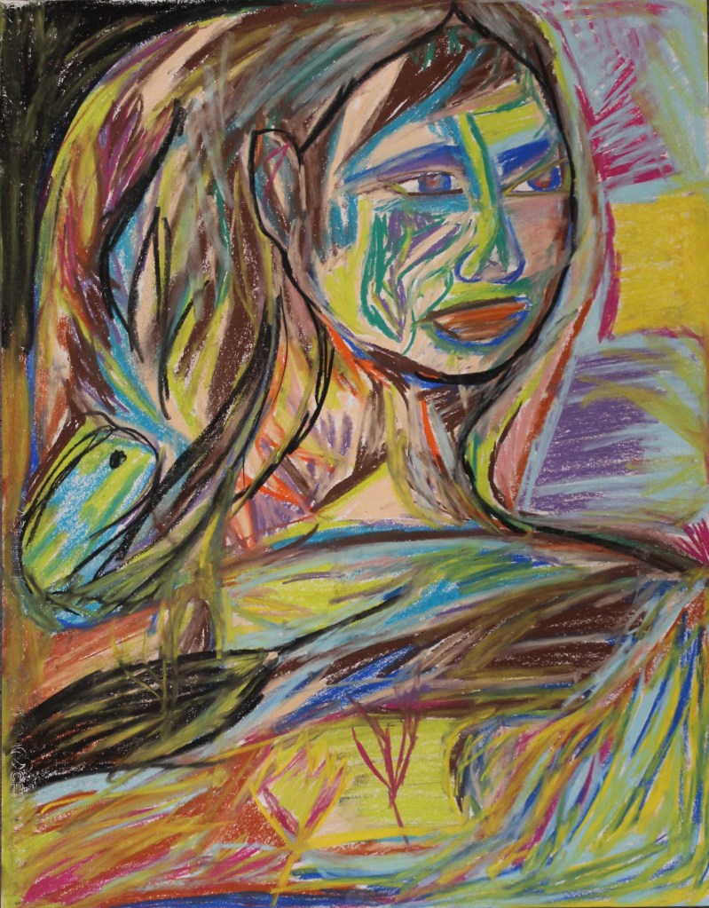 Série de tableaux dans un style brut, réalisés à la craie (pastels tendres et secs) et peintures acryliques.