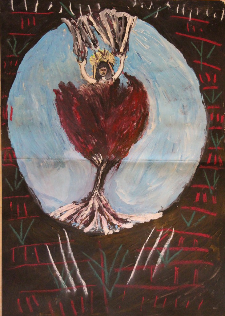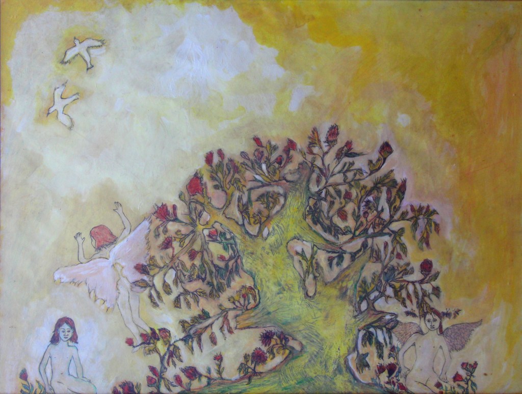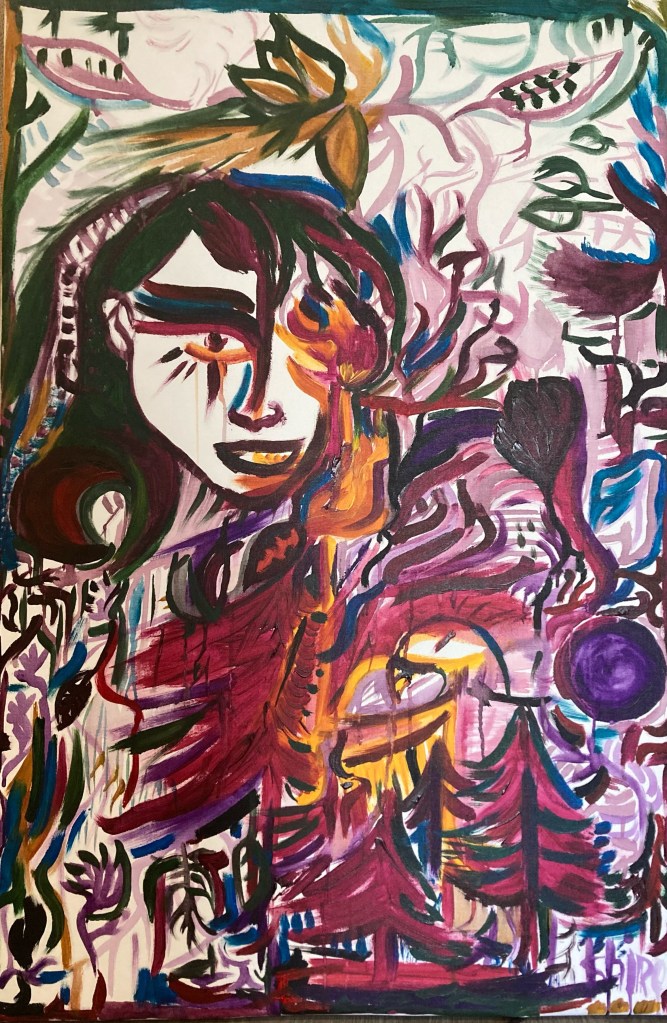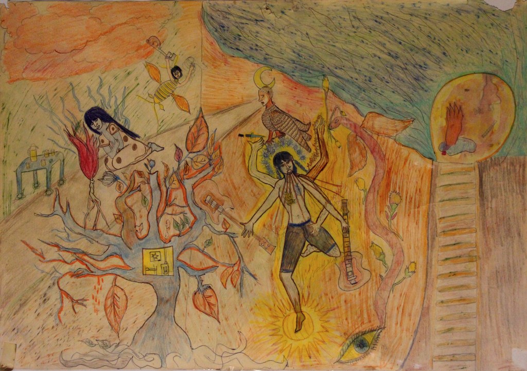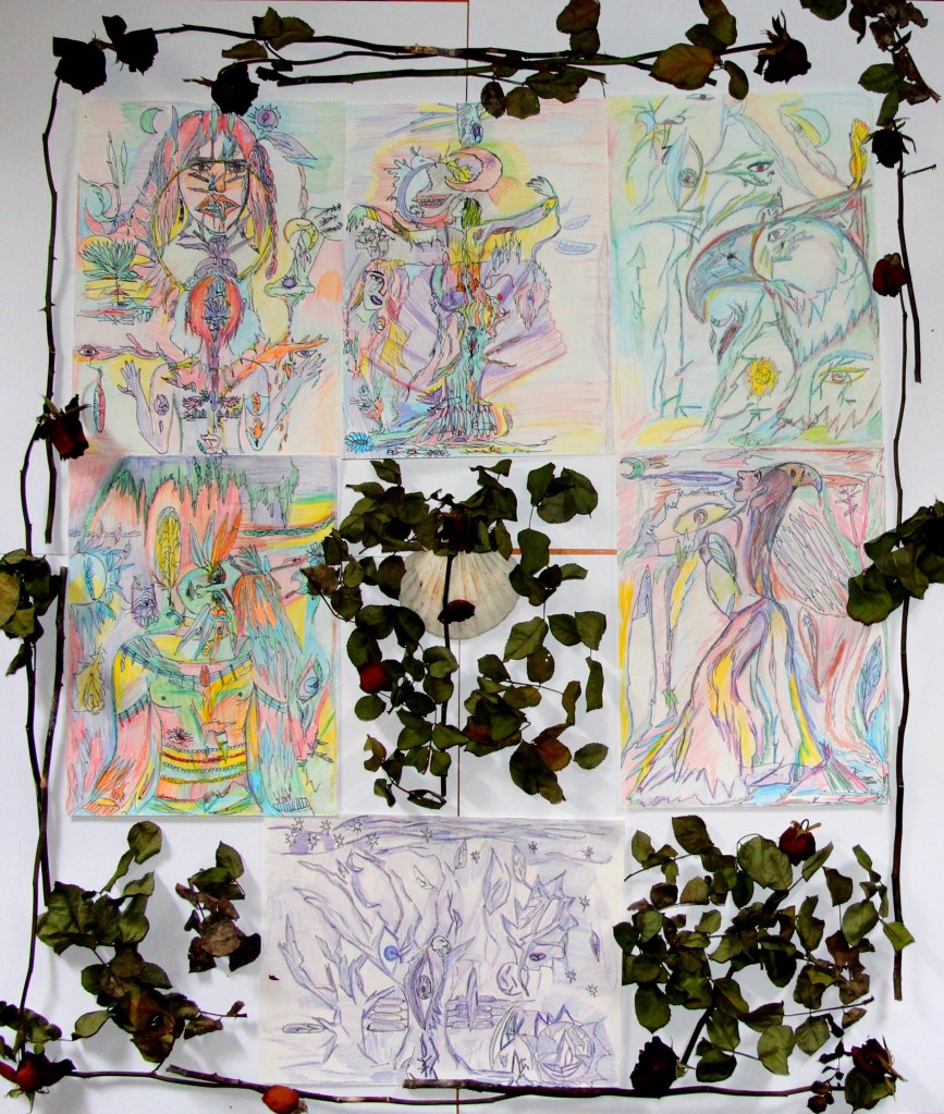 Série de Tableaux peints dans un style roots, avec divers éléments (gouaches, eau, crayons de couleurs, bic, peinture acrylique).