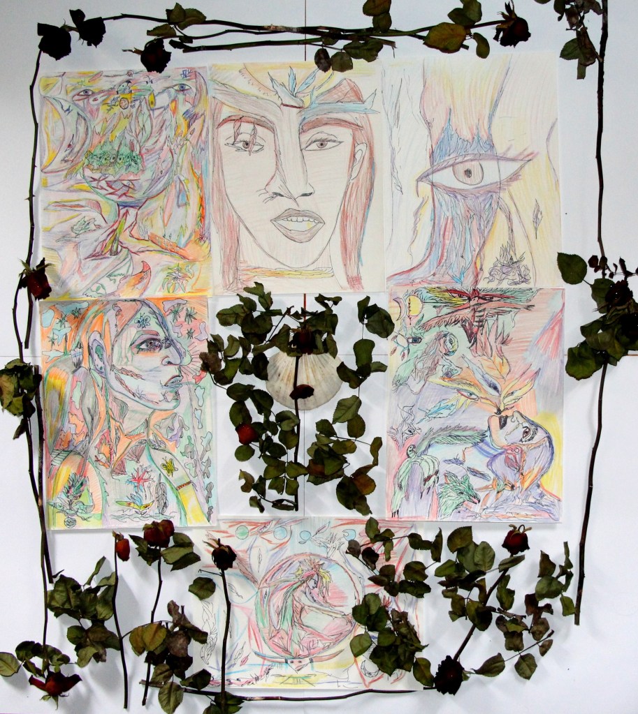 Recueil de dessins et herbier (Roses rouges séchées, crayons de couleurs, crayon à papier, marqueurs).