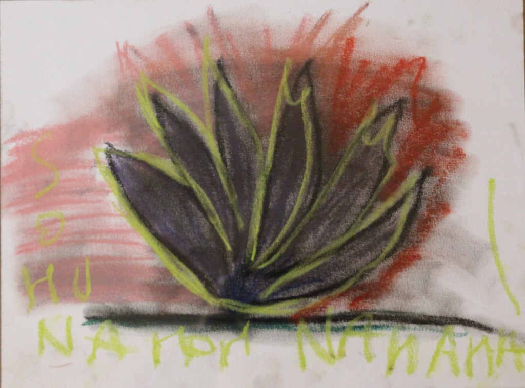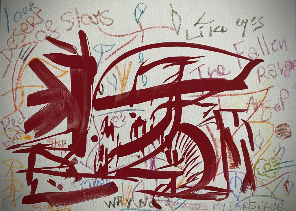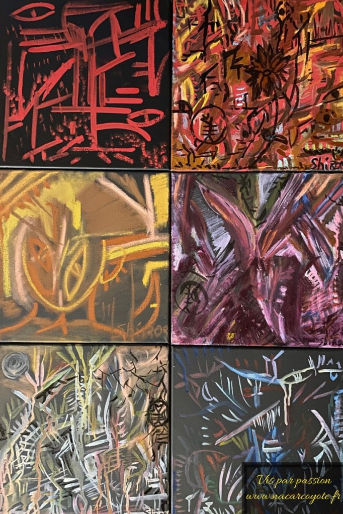 Craies sur toiles voulant rappeler un dessin dans un style brut sur du sable.